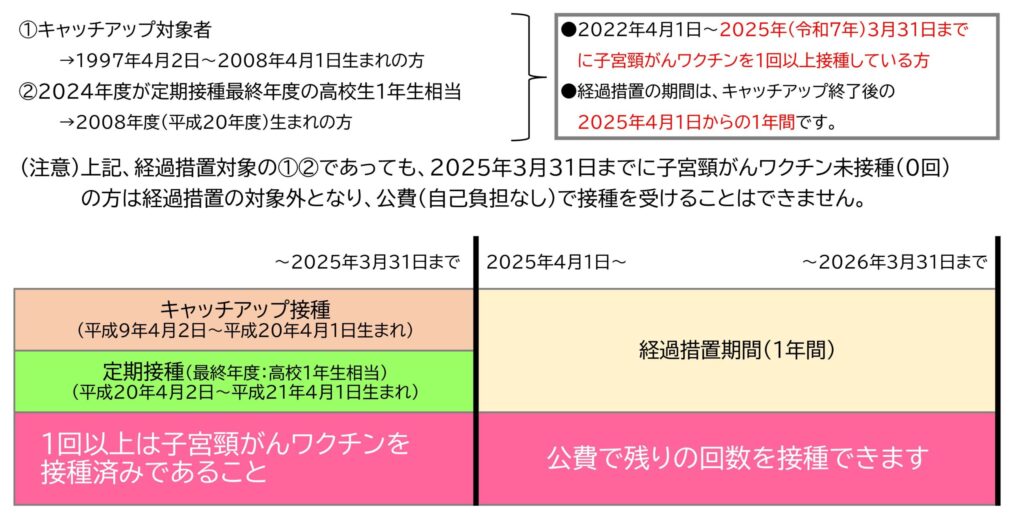 キャッチアップ接種により、2024年夏以降に子宮頸がんワクチン予防接種の需要が急増し、ワクチンの限定出荷されている状況を踏まえ、定期接種(2008度生まれの方限定)およびキャッチアップ接種の方が2025年3月末までに公費による3回接種を逃すことのないように経過措置(条件付き延長)が実施される予定です。