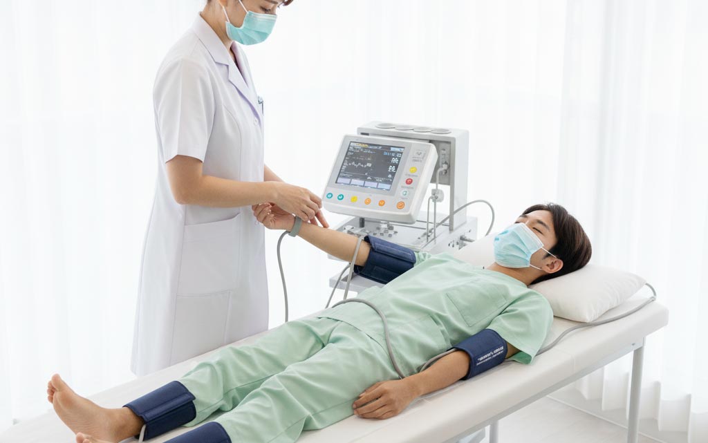 足関節上腕血圧比の検査で、足首と腕の血圧を測定し、その比率から動脈硬化や血管の狭窄・閉塞の程度を調べます。